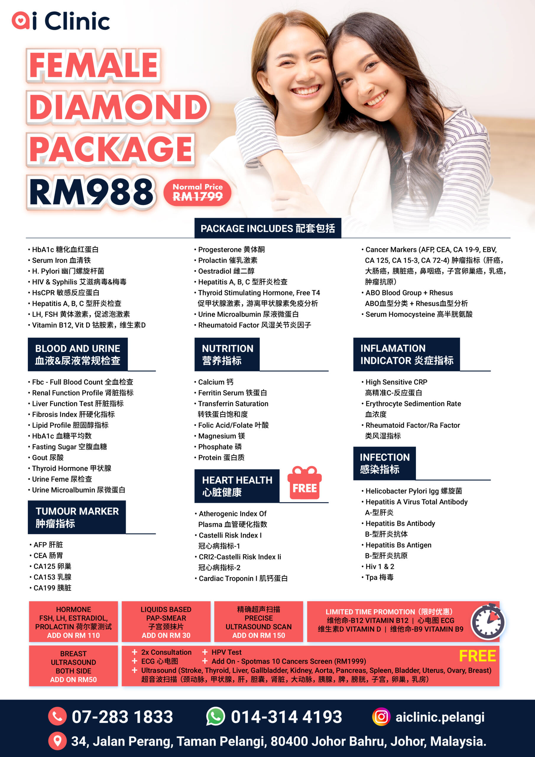 HomeHealth ScreeningFemale Diamond Package -45% Female Diamond PackageRM1,799.00 Original price was: RM1,799.00.RM988.00Current price is: RM988.00. Female Diamond Package quantity Buy now Category: Health Screening Product ID: 59472 Reviews (0) Reviews There are no reviews yet. Be the first to review “Female Diamond Package” Cancel replyYour email address will not be published. Required fields are marked *Name * Email * Save my name, email, and website in this browser for the next time I comment. Your rating * Rate… Perfect Good Average Not that bad Very poor Your review * I agree that my submitted data is being collected and stored. Related products STD Screening Common RM90.00 Buy now STD Screening Complete (Male) RM499.00 Buy now -66% LADY+HS 专属女性体检 RM888.00 Original price was: RM888.00.RM298.00Current price is: RM298.00. Buy now